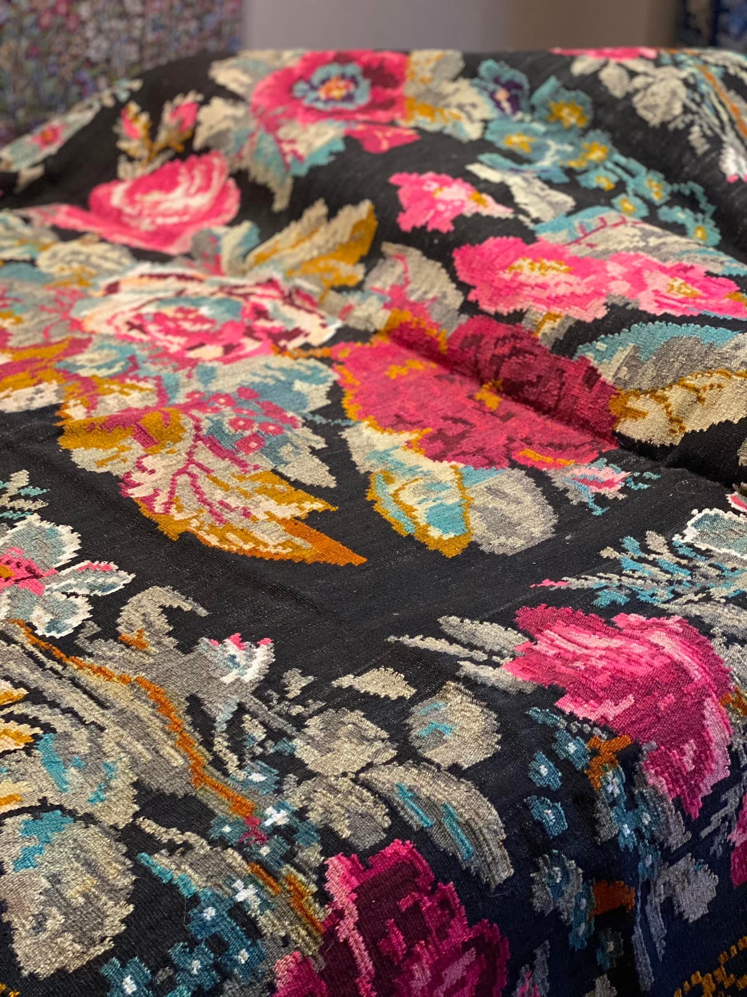 Už akių užkliuvo Gucci apartamentų nuotrauka. Jei kam įdomu, koks kilimas puošia apartamentus, atsakymas – jis iš Besarabijos. Galerijoje turiu tokį senovinį kilimą, jis atkeliavęs iš istorinių Besarabijos žemių, esančių pietryčių Europoje, tarp Pruto ir Dniestro upių. Tai šių dienų Moldavija. Ryškios rožės juodos vilnos fone. Gaivu ir kartu senoviška.
